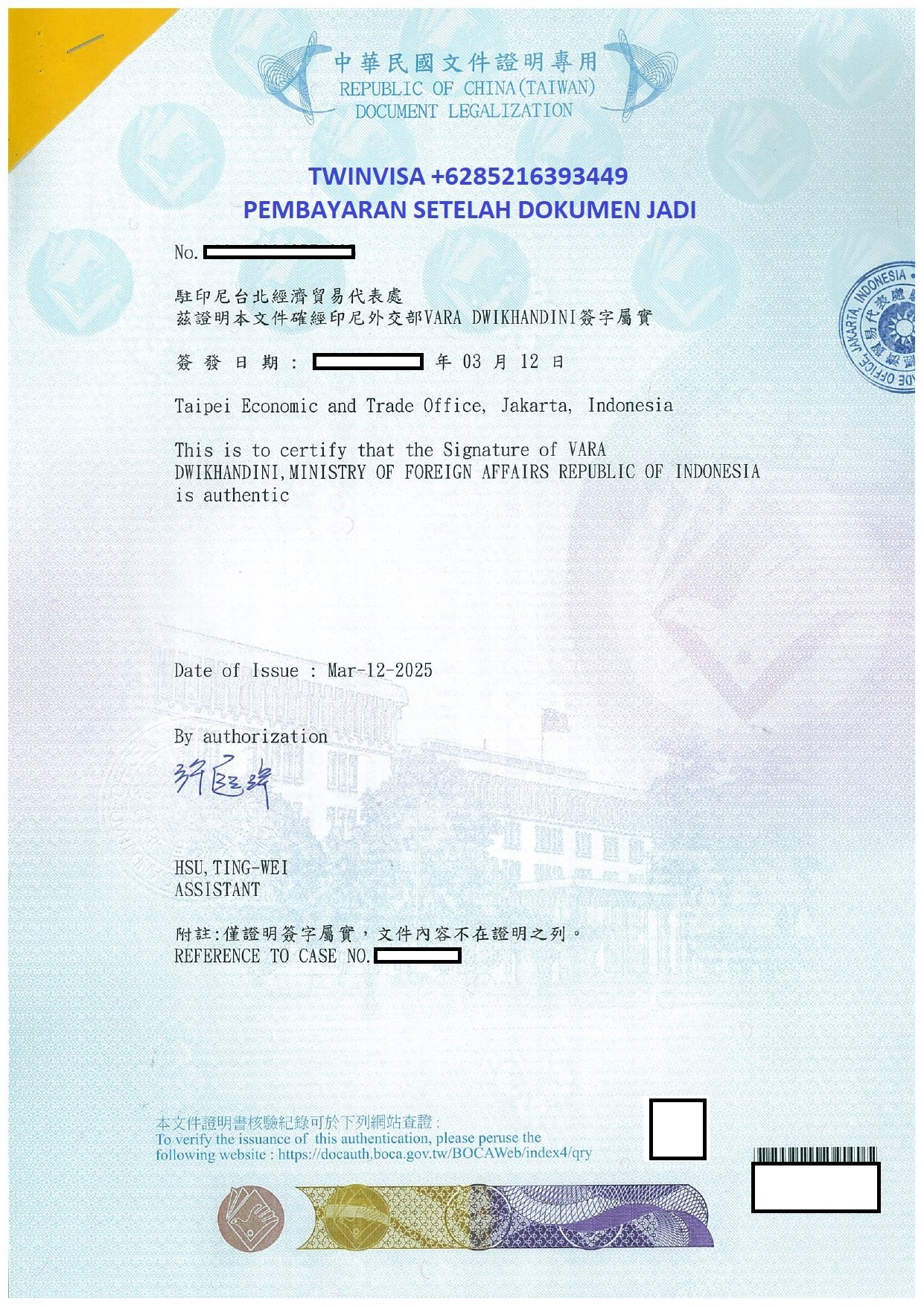 Bagi anda yang ingin melegalisir dokumen di kedutaan TETO/ Taiwan Jakarta untuk keperluan studi, bekerja, izin tinggal atau pengurusan visa. Percayakan legalisasi dokumen anda hanya kepada kami, dalam hitungan beberapa hari dokumen anda akan selesai.